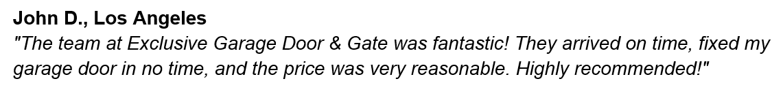 At Exclusive Garage Door & Gate, we pride ourselves on delivering exceptional service for all your garage door and gate needs. Based in Los Angeles, our team of experienced technicians is dedicated to ensuring your safety and convenience. Whether you need a repair, installation, or maintenance, we provide reliable solutions with professionalism and care. We understand the importance of a functional garage door or gate in securing your home or business, and we’re here to help, 24/7.